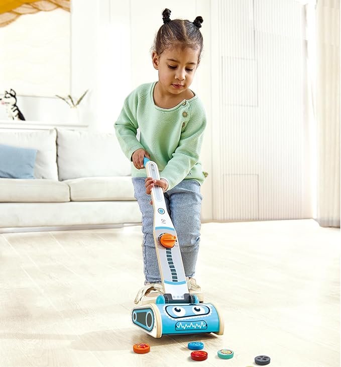 Impara a tenere tutto pulito con questo divertente aspirapolvere. Con la sua simpatica faccia da robot, potrai davvero aspirare i sei rifiuti inclusi.