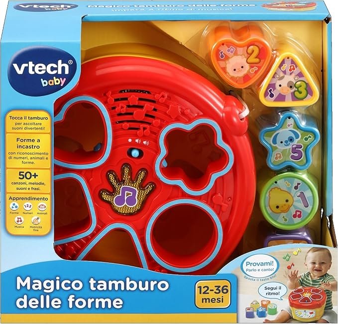 Con il Magico tamburo delle forme di VTech il tuo bambino impara a seguire il ritmo della musica e grazie a diversi e divertenti suoni scopre le forme, i numeri, gli animali e molto altro!