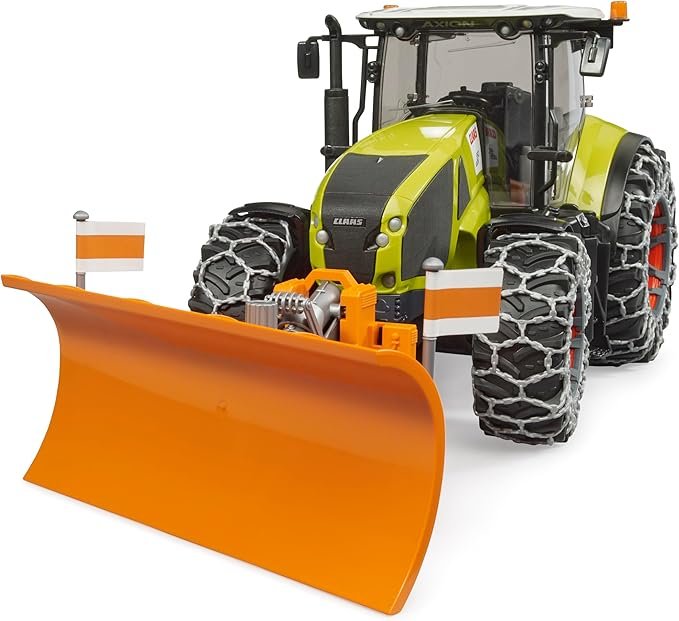 Trattore Claas Axion 950 con catene da neve e pala spazzaneve Bruder 03018
