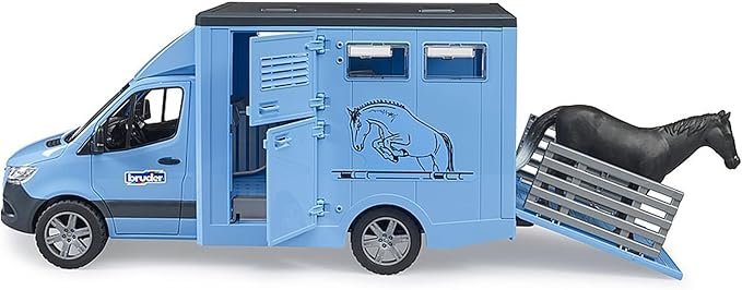 Il camion per il trasporto di animali dispone di un moderno allestimento per valigie specifico per specie con parete divisoria interna variabile e due abbeveratoi. Per caricare e scaricare i cavalli è possibile aprire la rampa; le griglie delle rampe assicurano una guida delicata degli animali all’interno e all’esterno del veicolo. Un cavallo in scala viene fornito già in dotazione; ulteriori cavalli sono disponibili con il codice articolo 02306. In questo veicolo possono essere trasportati al massimo due cavalli. La stalla dei cavalli bworld (n. art. 62506) si adatta perfettamente a questo furgone.